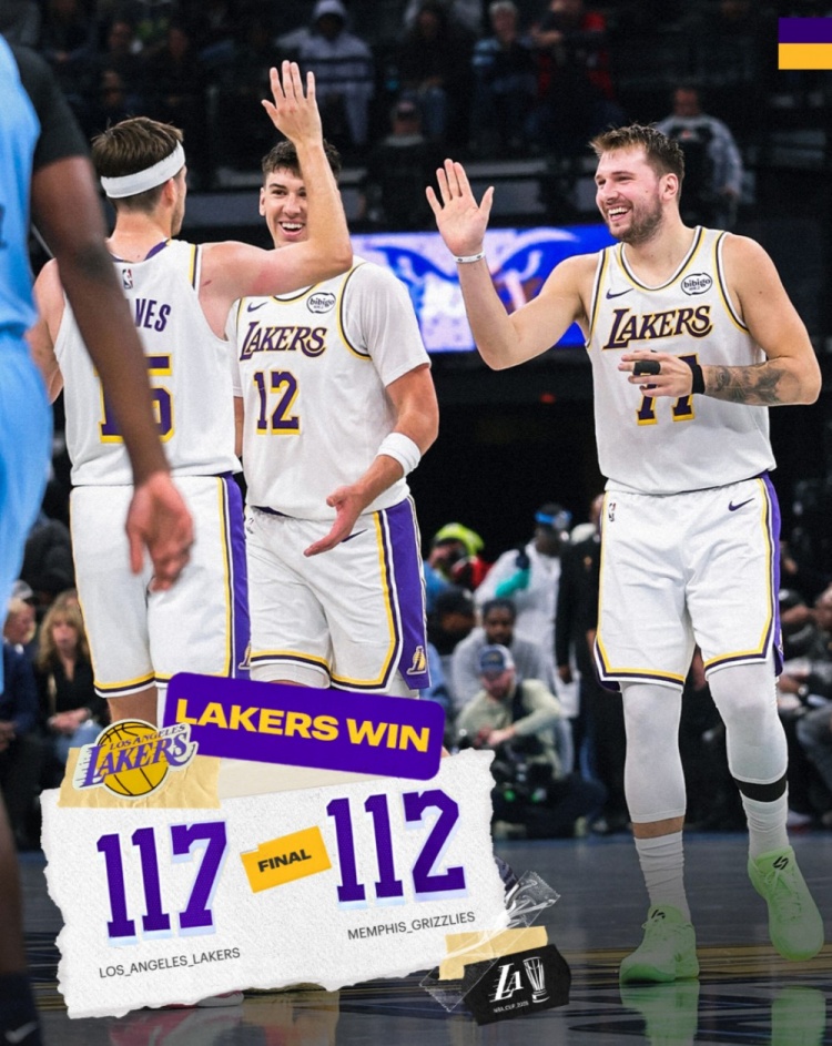In the first game of the NBA Cup group stage, the Lakers defeated the Grizzlies 117-112 away from home.  After the game, the Lakers officially released a poster for the team's victory. Doncic and Reeves celebrated with high-fives, including Laravia.  In this campaign, Doncic played 38 minutes and 49 seconds, making 14 of 27 shots, including 6 of 15 three-pointers, 10 of 13 free throws, and scored 44 points, 12 rebounds, and 6 assists. Reeves played 36 minutes, 5 of 14 shots, 2 of 8 three-pointers, 9 of 9 free throws, and scored 21 points, 4 rebounds, 4 assists, and 1 steal.