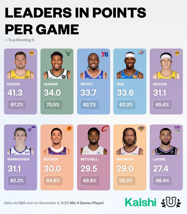 NBA University reported that two weeks into the new season, there are still 7 players averaging more than 30 points per game. Doncic only played 4 games due to injury, averaging as high as 41.3 points per game. Detailed rankings: 1, Doncic 41.3 points 2, Antetokounmpo 34 points 3, Maxi 33.7 points 4, Alexander 33.6 points 5, Reeve Si 31.1 points 6, Markkanen 31.1 points 7, Booker 30 points 8, Mitchell 29.5 points 9, Brunson 29 points 10, LaVine 27.4 points