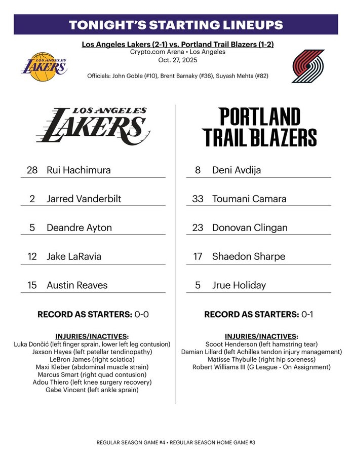 Today at 10:30, the Lakers will face the Trail Blazers back-to-back at home.  Redick changed the starting lineup for this game: Reeves, Laravia, Rui Hachimura, Van Der Biao, and Ayton.