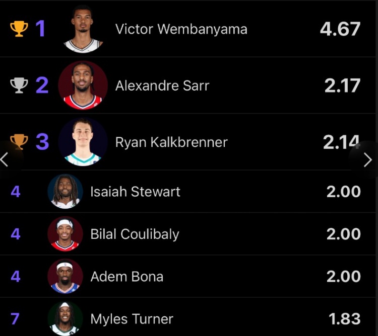 So far this season, Wenban Yama has played 6 times and sent out a total of 28 blocks, averaging 4.7 blocks per game. Both of these blocking statistics are league-leading.  On the list of average blocks per game, Sarr ranks second with about 2.2 times. In terms of total blocks, Wenban had 28 in 6 games, and second-placed Kalkbrenner had 15 in 7 games.