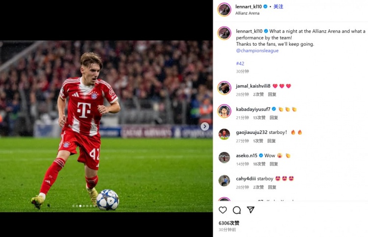 Bayern defeated Bruges 4-0 in this round of the Champions League. Young player Lennart Karl made a great start to the game.  It is worth mentioning that this was the first time in his career that he started in the Champions League. He scored his first goal in the Champions League and became the youngest Champions League scorer in the history of Bayern. He was also named the best player of the match by the Champions League official after the game for the first time.  He also posted his game photos on social media after the game with the text: "What a wonderful night at the Allianz Arena, the team's performance was outstanding! Thank you to the fans, we will continue to move forward."