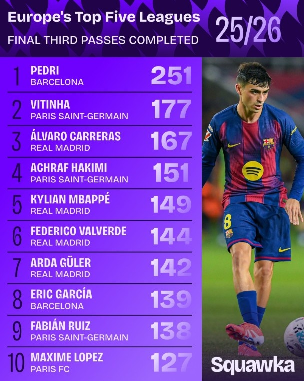 data website Squawka counts the number of passes completed in the offensive three zones in the five major leagues this season. Barcelona midfielder Pedri leads at the off-set, and Real Madrid 4 players entered the top ten. with five major leagues with passes completed in the third zone: 1, Pedri (Barcelona) 251 times 2, Vitinia (Paris) 177 times 3, Carreras (Real Madrid) 167 times 4, Ashraf (Paris) 151 times 5, Mbappe (Real Madrid) 149 times 6, Valverde (Real Madrid) 144 times 7, Guerre (Real Madrid) 142 times 8, Eric Garcia (Barcelona) 139 times 9, Fabian Ruiz (Paris) 138 times 10 Maxim Lopez (Paris FC) 127 times
