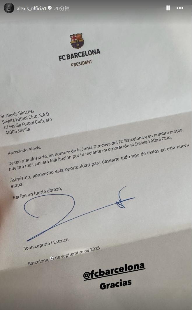 36-year-old Chilean forward and former Barcelona player Sanchez returns to La Liga to join Sevilla this summer. Today he updated his social media and displayed a congratulatory letter from his old boss Barcelona. The letter roughly states: Dear Alesis, on behalf of the Board of Directors of the Barcelona Football Club and myself, I would like to extend my most sincere congratulations to you for your recent joining of the Sevilla Club. I also take this opportunity to wish you success in the new stage. I'll give you a big hug. ——Joan-Laporta, Barcelona September X, 2025. Sanchez posted the text "Thank you" in this update and @Barcelona Club. Sanchez played for Barcelona from 2011 to 2014, contributing 46 goals and 38 assists to Barcelona in 141 games.