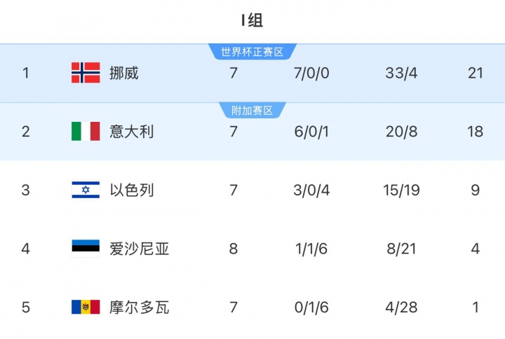 There is only one final round left in Group I of the European Zone of the World Cup Qualifiers. Norway leads Italy by 3 points + 17 goal difference. Norway has basically locked in the direct quota, leaving Italy with only a theoretical possibility. The two teams will face off directly in the final round. Italy must beat Norway by at least 9 goals to advance directly to the World Cup. In the match against Moldova, the bottom team in the group, Norway scored 16 goals in 2 games, conceded 1 goal, and gained 15 goal differentials, while Italy scored 4 goals in 2 games, conceded 0 goals, and only achieved 4 goal differentials, opening up a gap of 11 goal differentials. In addition, in the first round match between the two sides, Norway defeated Italy 3-0 at home, opening up a 6-goal gap in terms of goal difference.