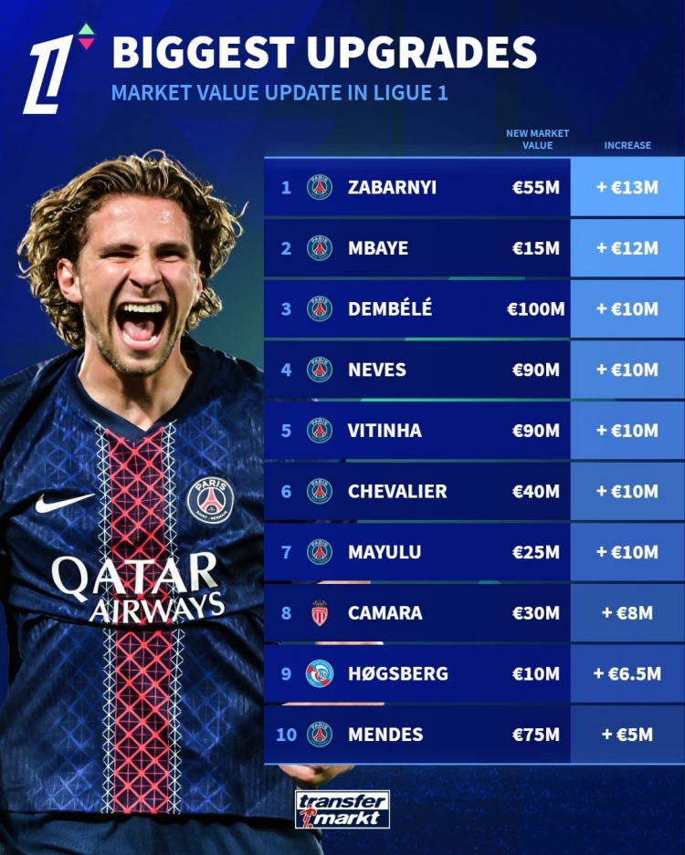The German transfer market updated the value of Ligue 1 players and listed the list of rising values. Zabarni topped the list with +13 million euros, and Paris players occupied the top 7. Ligue 1 player value increase ranking: Zabarny (Paris, 55 million euros): +13 million euros Mbaye (Paris, 15 million euros): +12 million euros Dembele (Paris, 100 million euros): +10 million euros Joao Neves (Paris, 90 million euros): +10 million euros Vitinha (Paris, 90 million euros): +1 0 million euros Chevalier (Paris, 40 million euros): +10 million euros Mayulu (Paris, 25 million euros): +10 million euros Camara (Monaco, 3 0 million euros): +8 million euros Horsberg (Strasbourg, 10 million euros): +6.5 million euros Nuno Mendes (Paris, 75 million euros): +5 million euros