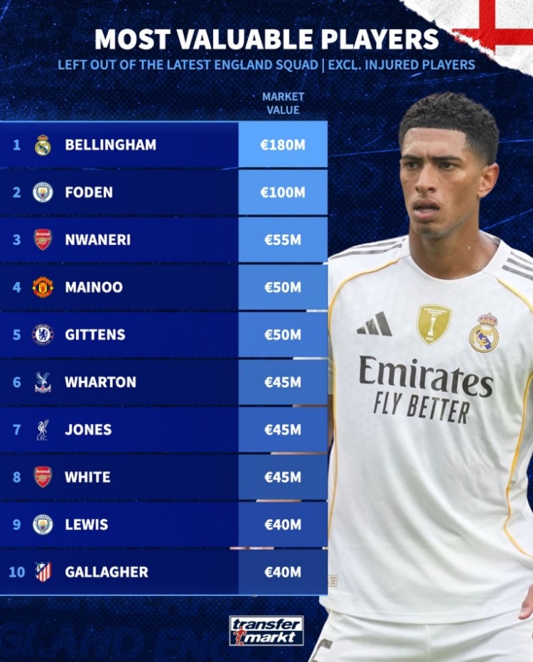England has announced the latest team list, and Germany also took stock of the players' value list (except for injured players), which is as follows: 1, Bellingham 180 million euros 2, Foden 100 million euros 3, Envanerie 55 million euros 4, Maynu 50 million euros 5, Gittens 50 million euros 6, Walton 45 million euros 7, Jones 45 million euros 8, Ben White 45 million euros 9, Lewis 40 million euros 10, Gallagher 40 million euros