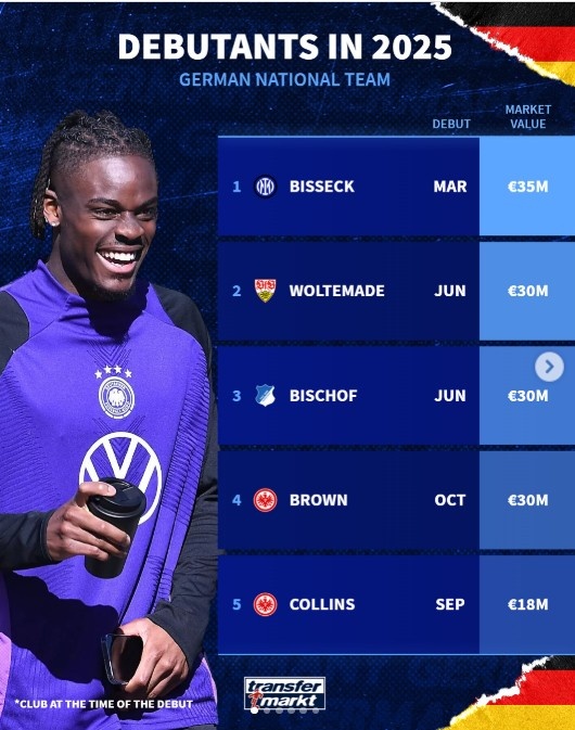 The German transfer market has taken stock of the players from the football powerhouse who will make their debut in 2025. A total of 5 players from Germany made their debut, including Bieseke and Walter Mader. The following is the value of players who will make their debut for the German team in 2025 (the time of their debut is the club they are playing at that time): Bicek (Inter Milan, made his debut in March): 35 million euros Waltermade (Stuttgart, made his debut in June): 30 Million euros Bischoff (Hoffenheim, debuted in June): 30 million euros Brown (Frankfurt, debuted in October): 30 million euros Collins (Frankfurt, debuted in September): 18 million euros