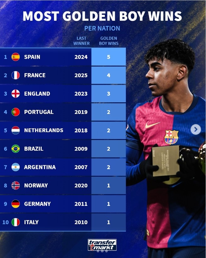 Paris Saint-Germain youngster Douay won the 2025 Golden Boy Award. Dezhuan counted the number of times players from various countries have won the Golden Boy Award, and Spain ranked first with 5 times. The following is the number of times players from each country have won the Golden Boy Award: 1. Spain: 5 times 2. France: 4 times 3. England: 3 times 4. Portugal: twice 5. Netherlands: twice 6. Brazil: twice 7. Argentina: twice 8. Norway: once 9. Germany: once 10. Italy: once