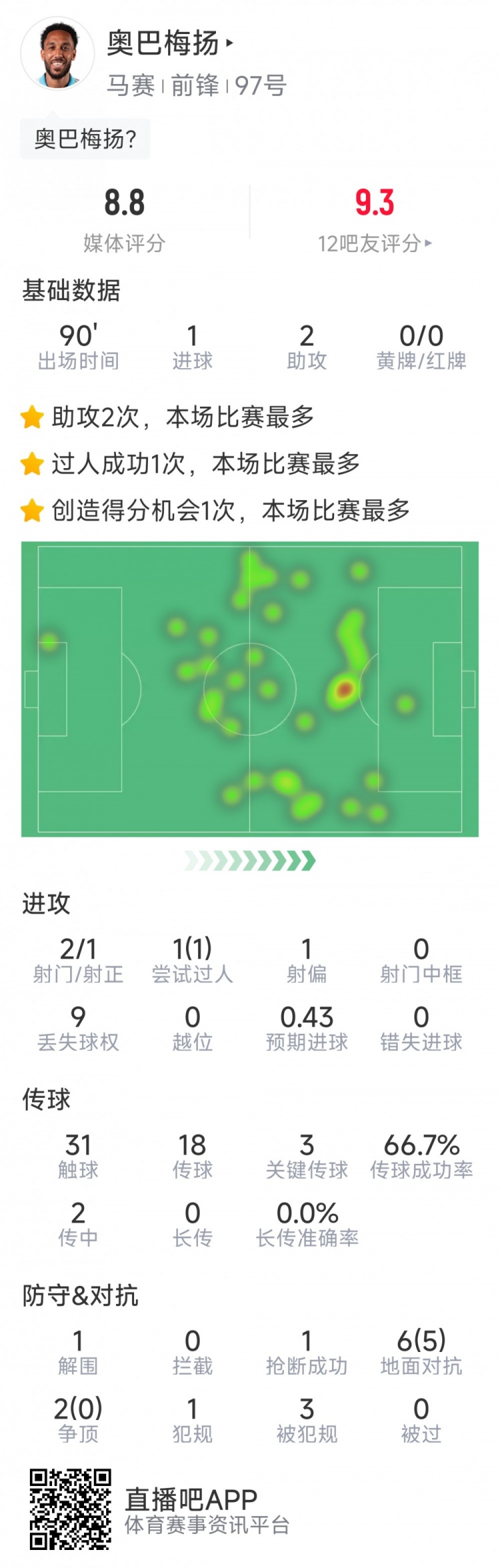 Rejuvenating the second spring, Aubameyang s data in this game: 1 goal, 2 assists, 3 key passes