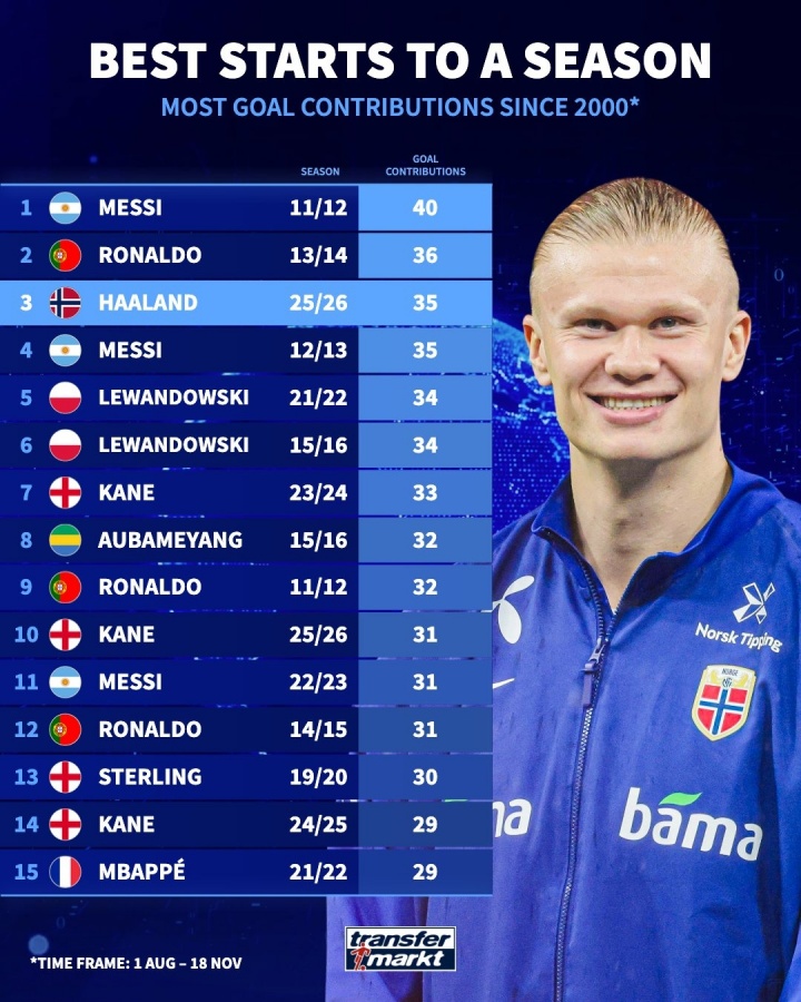 Dezhuan counted the number of goal contributions at the beginning of this century's season. Harland ranked third in history with 35 goals, second only to Messi and Ronaldo. The number of goals contributed by the best start to the season this century: (August 1st - November 18th) 1. Messi 40 goals in the 11/12 season 2. Cristiano Ronaldo 36 goals in the 13/14 season 3. Haaland 35 goals in the 25/26 season 4. Messi 12/13 season 35 goals 5. Lewandowski 21/22 season 34 goals 6. Lewandowski 15/16 season 34 goals 7. Kane 23/24 season 33 goals 8. Aubameyang 15/16 season 32 goals 9. Ronaldo 11/12 season 32 goals 10. Kane 25/26 season 31 goals 11. Messi 22/23 season 31 goals 12. Cristiano Ronaldo 14/15 season 31 goals 13. Sterling 19/20 season 30 goals 14. Kane 24/25 season 29 goals 15, Mbappe 29 goals