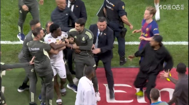According to the Spanish media Eldesmarque, as the Eldesmarque match was coming to an end, Barcelona midfielder Pedri received a second yellow card and was sent off. This incident became a "flash" and directly triggered a "large-scale melee" between the benches of both sides. The situation got so out of control that security had to quickly intervene and forcibly separated the benches of the two teams.  However, the final whistle did not calm the players' anger, and "sparks burst out again." Vinicius, who had been "simmering with anger" due to a previous quarrel with Real Madrid coach Alonso, seemed particularly excited.  At the same time, Barcelona youngster Yamal was also photographed walking towards Real Madrid goalkeeper Courtois and "saying something to him." Subsequently, players from both sides "got into an argument again." The aftermath of this incident is still under development.