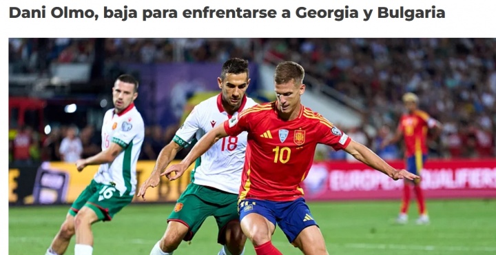 The Spanish national team officially announced that Barcelona player Olmo has muscle discomfort and has withdrawn from the Spanish national team. Spain National Team Announcement Dani Olmo will be unable to participate in the games against Georgia in Elche and against Bulgaria in Valladolid due to injury. When the player arrived at the national team training camp last Monday, he showed signs of muscle fatigue, as reported by FC Barcelona. Since then, symptoms have gradually improved through treatment and stress management. Therefore, the forward was originally scheduled to only complete part of the scheduled training today, but he expressed muscle discomfort in his left leg during training. In view of this, additional examinations have been carried out and the diagnosis was muscle injury. The situation has been reported to the FC Barcelona medical department. The player will start rehabilitation treatment in the national team training camp, and he will return to Barcelona tomorrow when the team goes to Elche to prepare for the match with the Georgian national team. Spain will face Georgia and Bulgaria on October 12 and 15 respectively.