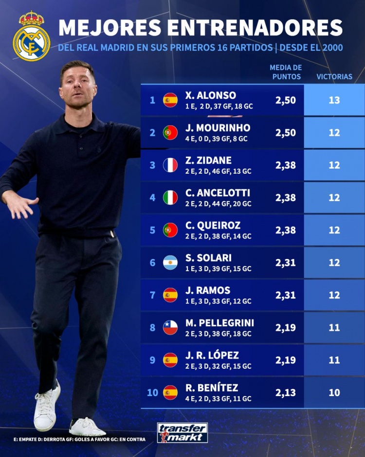 The German Transfer Market has counted the wins of the Real Madrid coach's first 16 games since 2000 and listed them. Alonso leads the list with 13 wins, followed by Mourinho, Zidane and Ancelotti with 12 wins. Winning list of Real Madrid coach’s first 16 games since 2000: Alonso-2.5 points-13 wins Mourinho-2.5 points-12 wins Zidane-2.38 points-12 wins Ancelotti-2.38 points-12 wins Quiroz-2 .38 points - 12 wins Solari -- 2.31 points -- 12 wins Juande Ramos -- 2.31 points -- 12 wins Pellegrini -- 2.19 points -- 11 wins Lopez -- 2.19 points -- 11 wins Benitez -- 2.13 points -- 10 wins