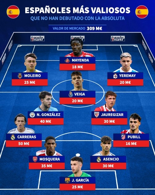 The German transfer market lists the lineup of the most valuable Spanish players who have not yet represented the national team. Carreras, Nico Gonzalez, Asensio, and Juan Garcia are on the list. The most valuable lineup yet to represent Spain (total price 309 million euros) Goalkeeper: Joan Garcia (Barcelona, 25 million euros) Defenders: Carreras (Real Madrid, 50 million euros), Mosquera (Arsenal, 35 million euros), Asensio (Real Madrid, 30 million euros), Pubil (Atletico Madrid, 16 million euros) Midfielder: Nico Gonzalez (Man City, 40 million euros), Vega (Porto, 20 million euros), Mikel Jaureguisar (Athletic Bilbao, 30 million euros) Forwards: Morello (Villarreal, 25 million euros), Eliesel Meenda (Sunderland, 18 million euros), Jeremiah (Deportivo, 20 million euros)